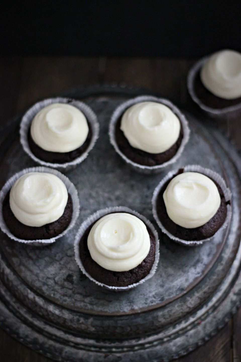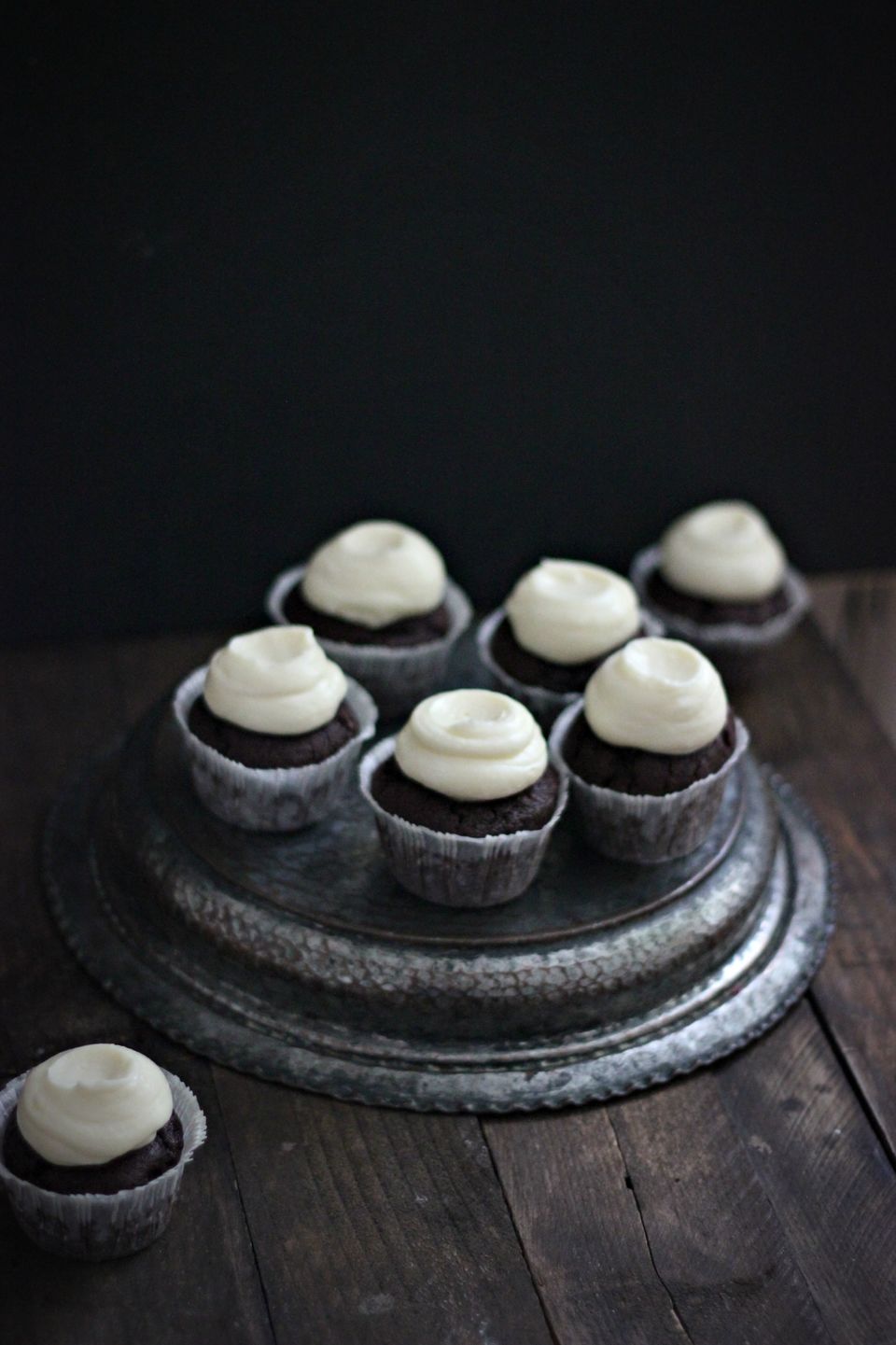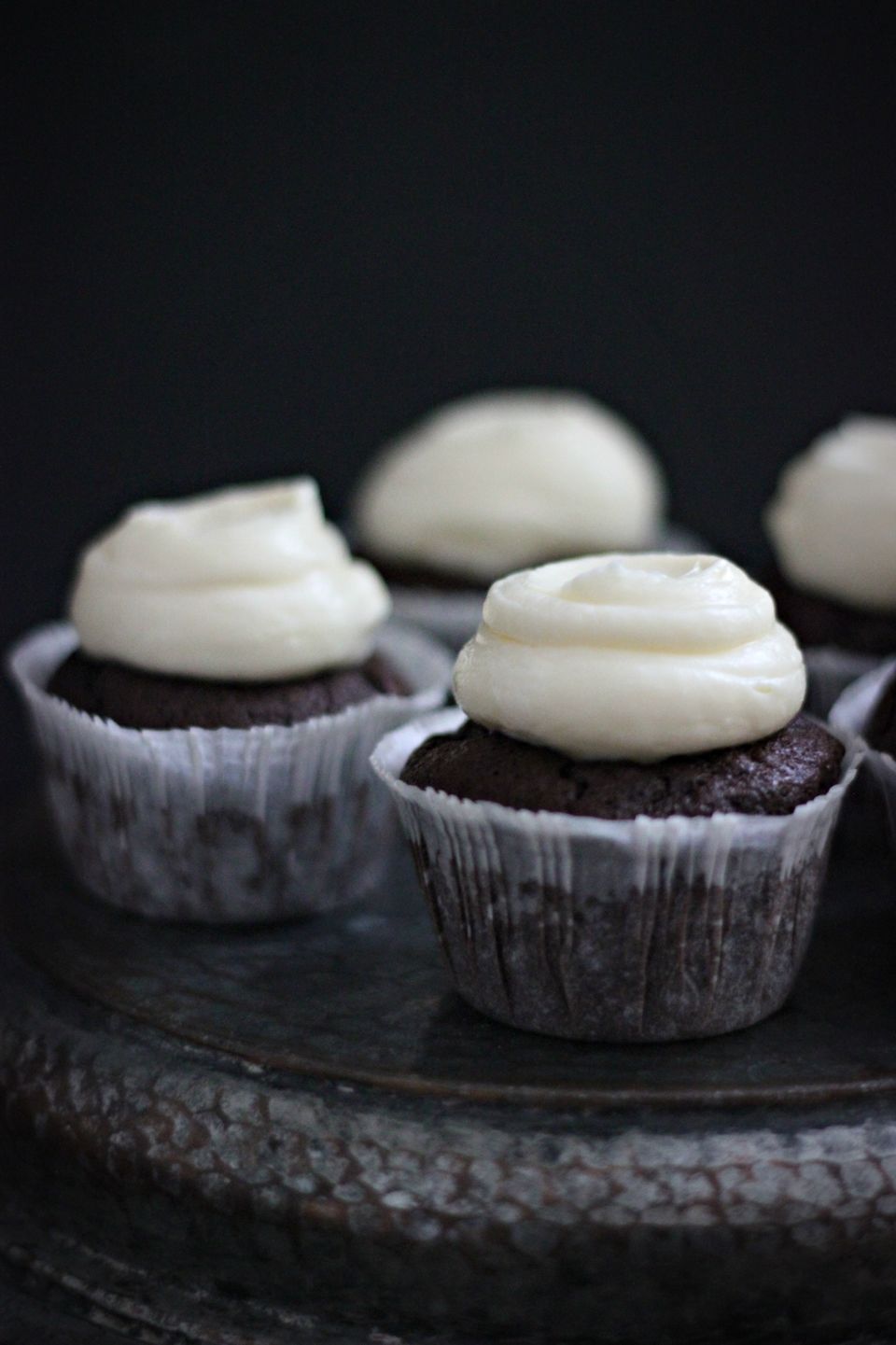 Forvarm ovnen til 180°C. I en skål for sig, blandes mel, salt, kakao og bagepulver og sættes så til side. I en anden skål piskes sukker og æg sammen til en luftig masse. Smelt smørret i en gryde ved lav varme og tag derefter gryden af varmen. Rør straks de 100 g mørk chokolade i det smeltede smør og rør godt rundt til al chokoladen er smeltet. Rør chokolade/smørblandingen i æggesnapsen, sammen med mælk lidt ad gangen. Bland nu de våde ingredienser sammen med de tørre og kom dejen i cupcake forme. Bag i ca 15 minutter og lad dem så køle helt af.